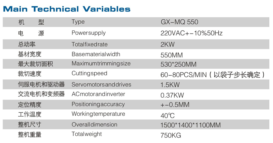 產(chǎn)品簡介: PRODUCT BRIEF 適用材料PET/PE.PET/CPP.BOPP/PE.PET/ AL/NY/PE. PET/NY/PE.等 特點 1.適用于軟包裝各種異型袋制袋,應用范圍廣,性價比高 2.加工的異型袋產(chǎn)品精度高,大大提高產(chǎn)品的合格率和節(jié)省了模具費用 3.投入成本低,連接在制袋機上,在線生產(chǎn)效率高。 4.新型的異型袋加工設備,產(chǎn)品具有人性化 5.安全和可靠性高; FEATURES 1. apply various soft packaging bag, wide application range, high cost; 2. high precision machining special-shaped Bag products, greatly improve the qualification rate of products and save mold cost; 3. low input costs, connected at bag making machine, high production efficiency 4. new sbecial-shabed bags of processing equipment, humanized the product 5. Security and high reliability 樣品